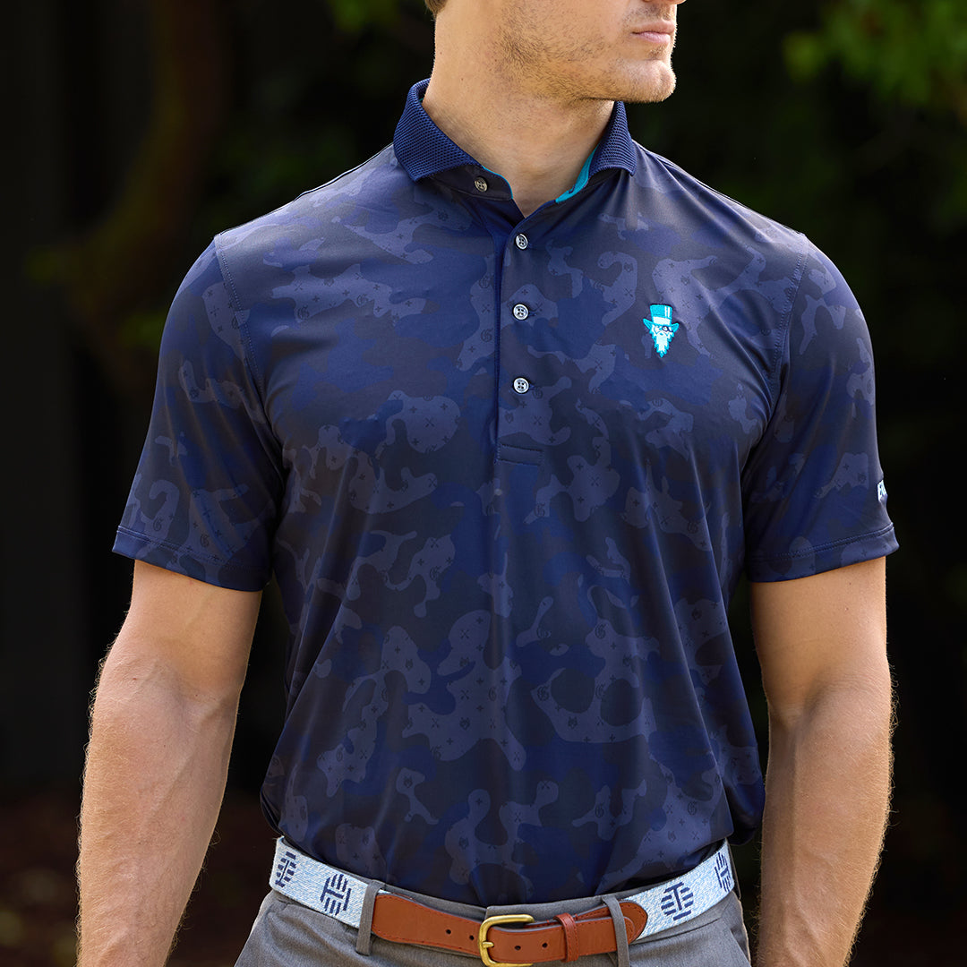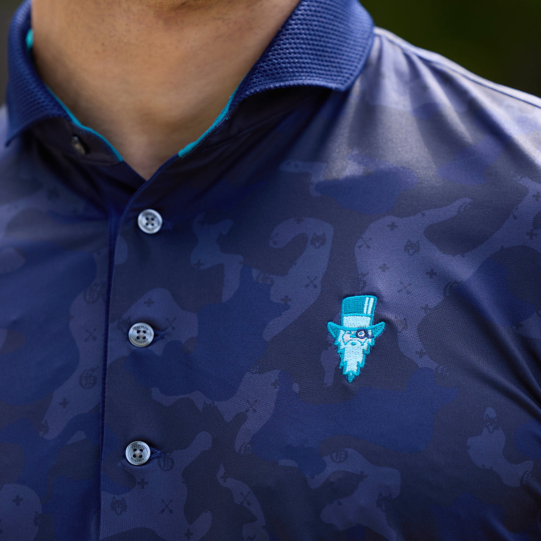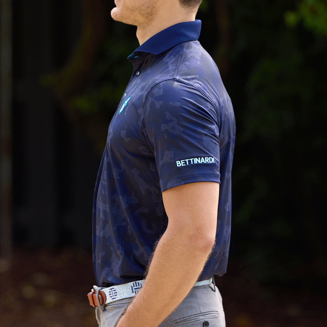 The Gangster Wizard G.O.A.T. Camo Polo reimagines the classic camouflage pattern, featured on luxurious fabric for a refined, modern look. Showcasing a Gangster Wizard on the left chest and Bettinardi on the left sleeve and designed with breathability, quick-drying, and four-way stretch, this performance printed polo moves with you throughout the day. The four-button placket, contrast details under and on top of the placket, and a jacquard knit collar elevate the style. (90% Recycled Polyester, 10% Spandex)