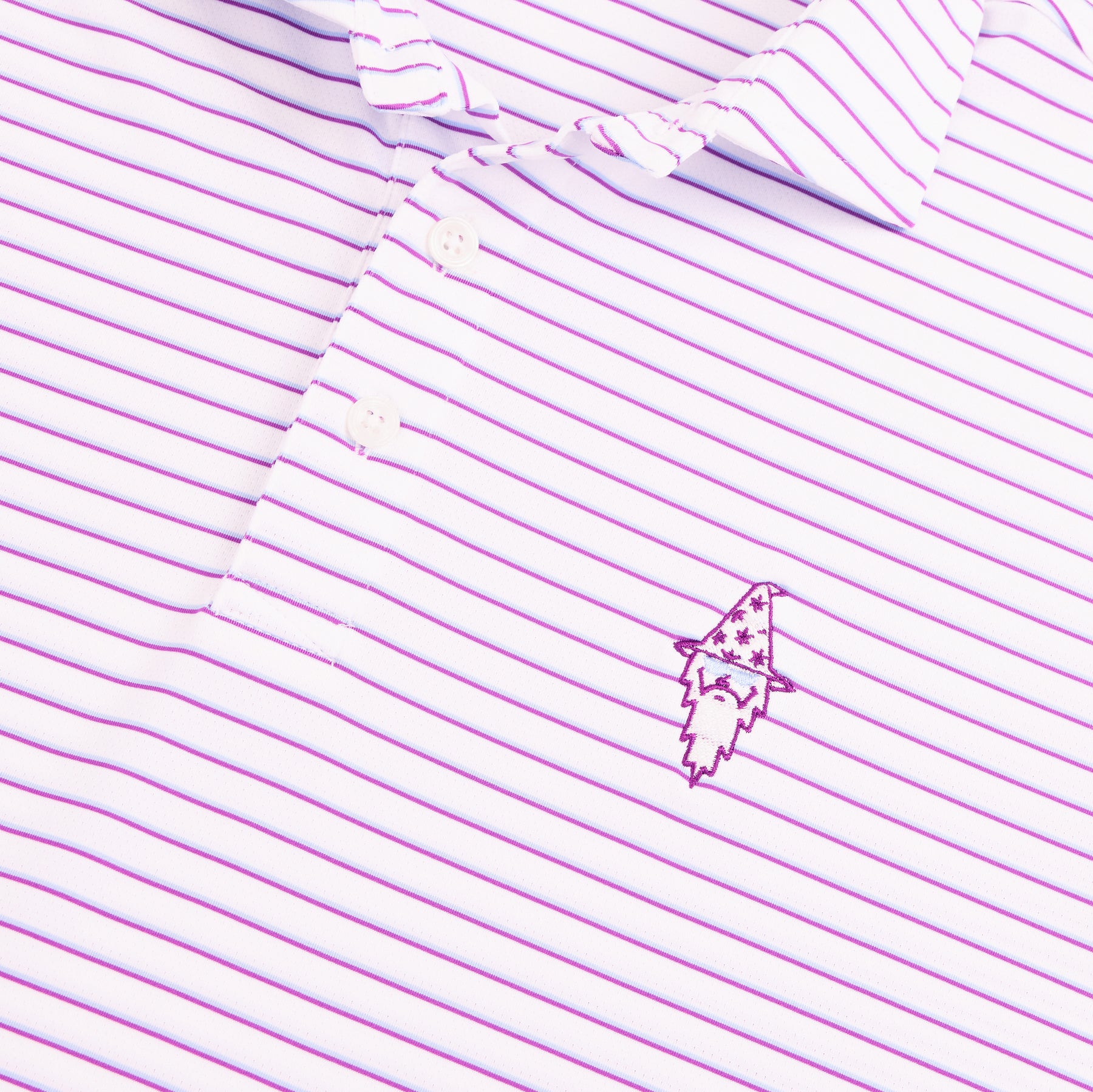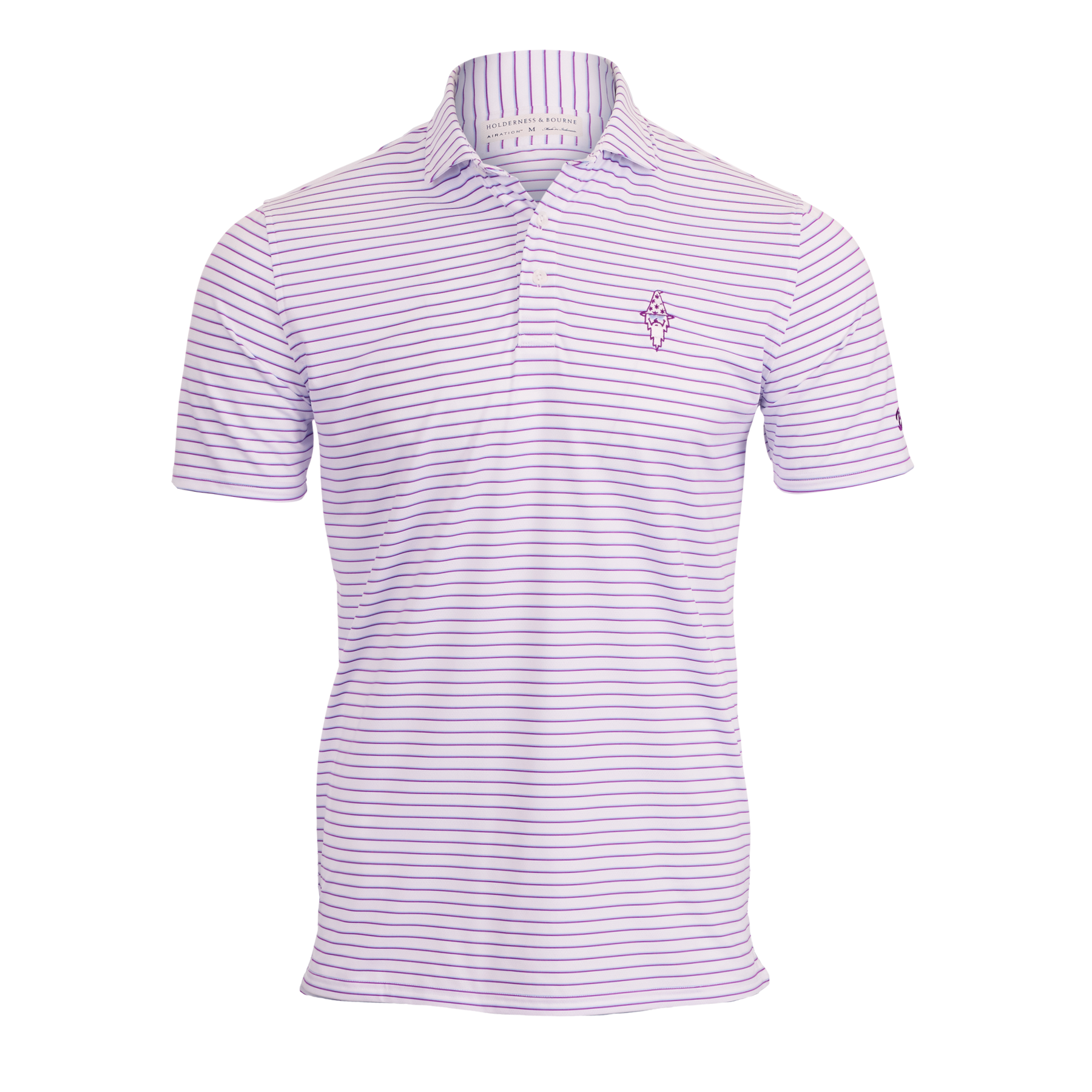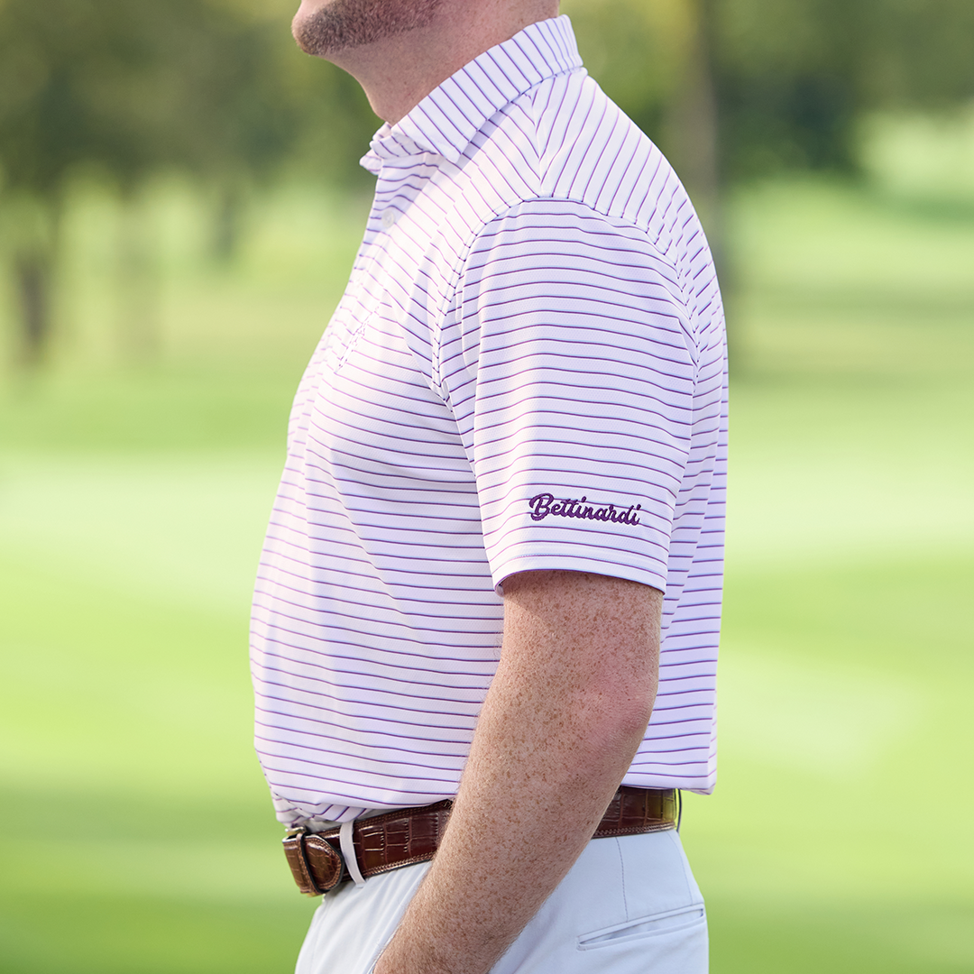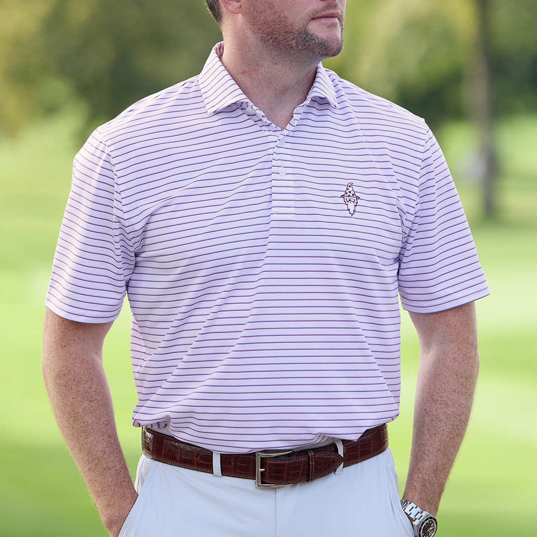 Give your golf wardrobe a boost with the rich stripes and refined tailoring of the Sunglasses Wizard Springer polo. Featuring our Sunglasses Wizard and Bettinardi on the left sleeve, Holderness & Bourne's exclusive AIRATION® fabric for this polo provides exceptional comfort and breathability in warmer weather thanks to its perforated knit construction, 4-way stretch, and moisture-wicking properties. Finished with a distinctive structured spread collar and H&B signature fit. (85% Polyester, 15% Elastane)