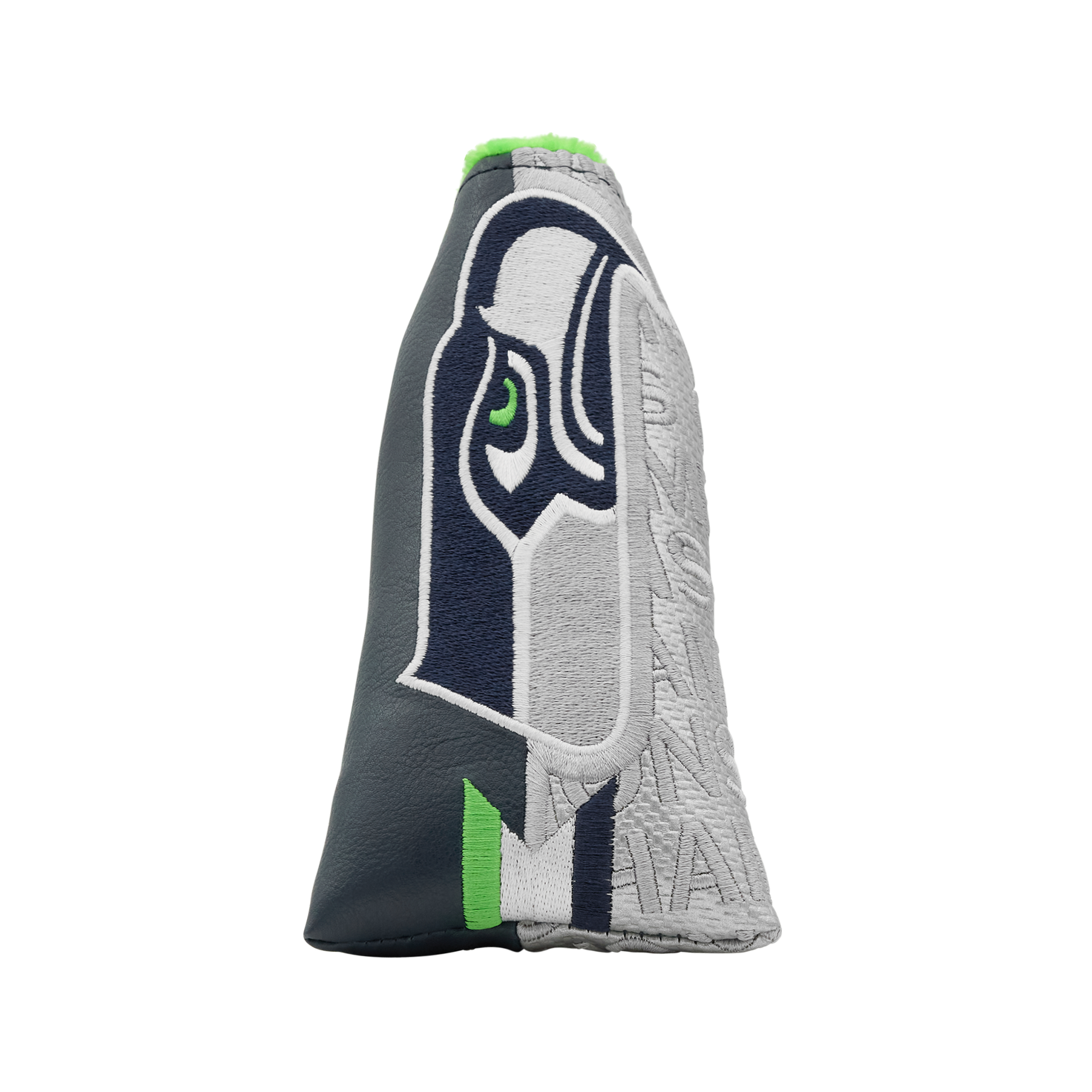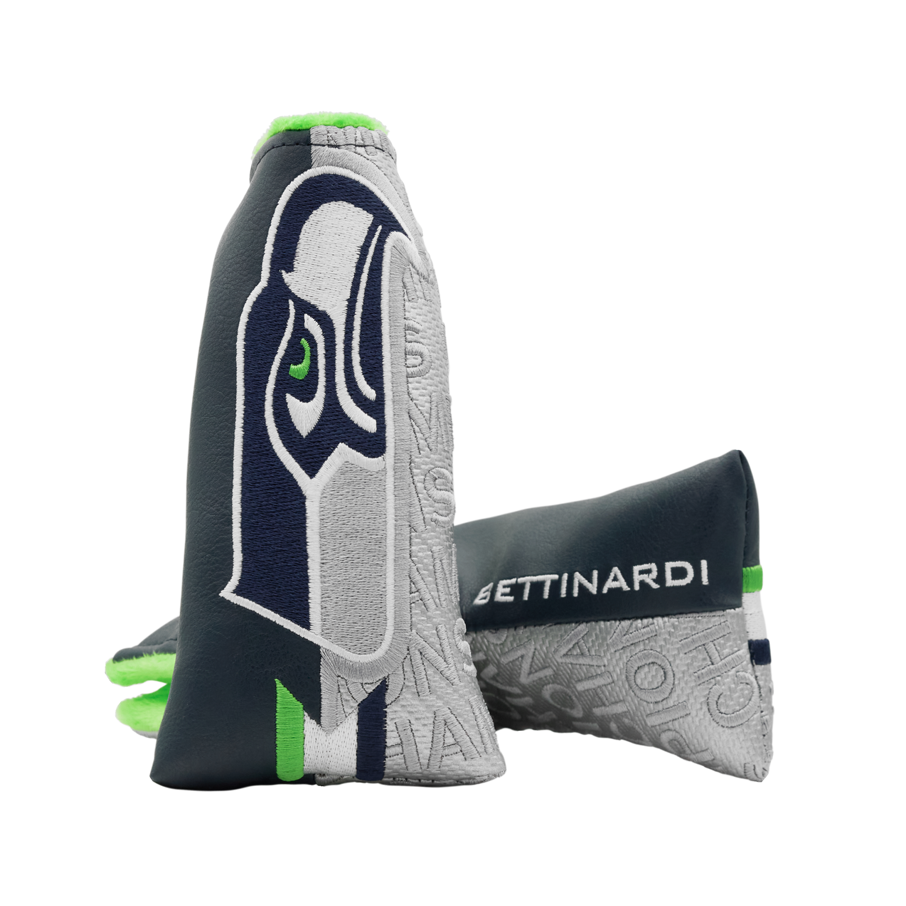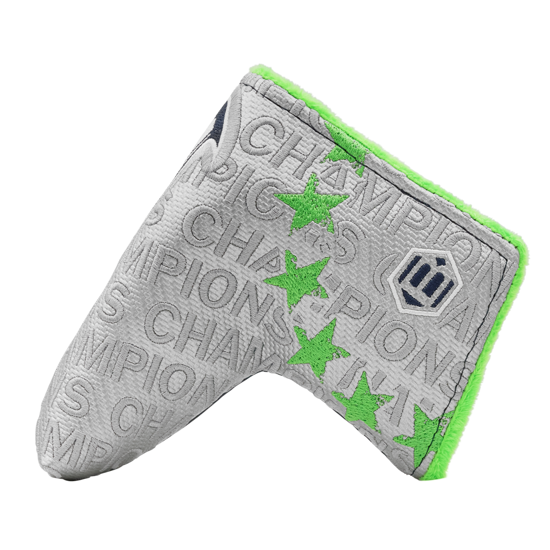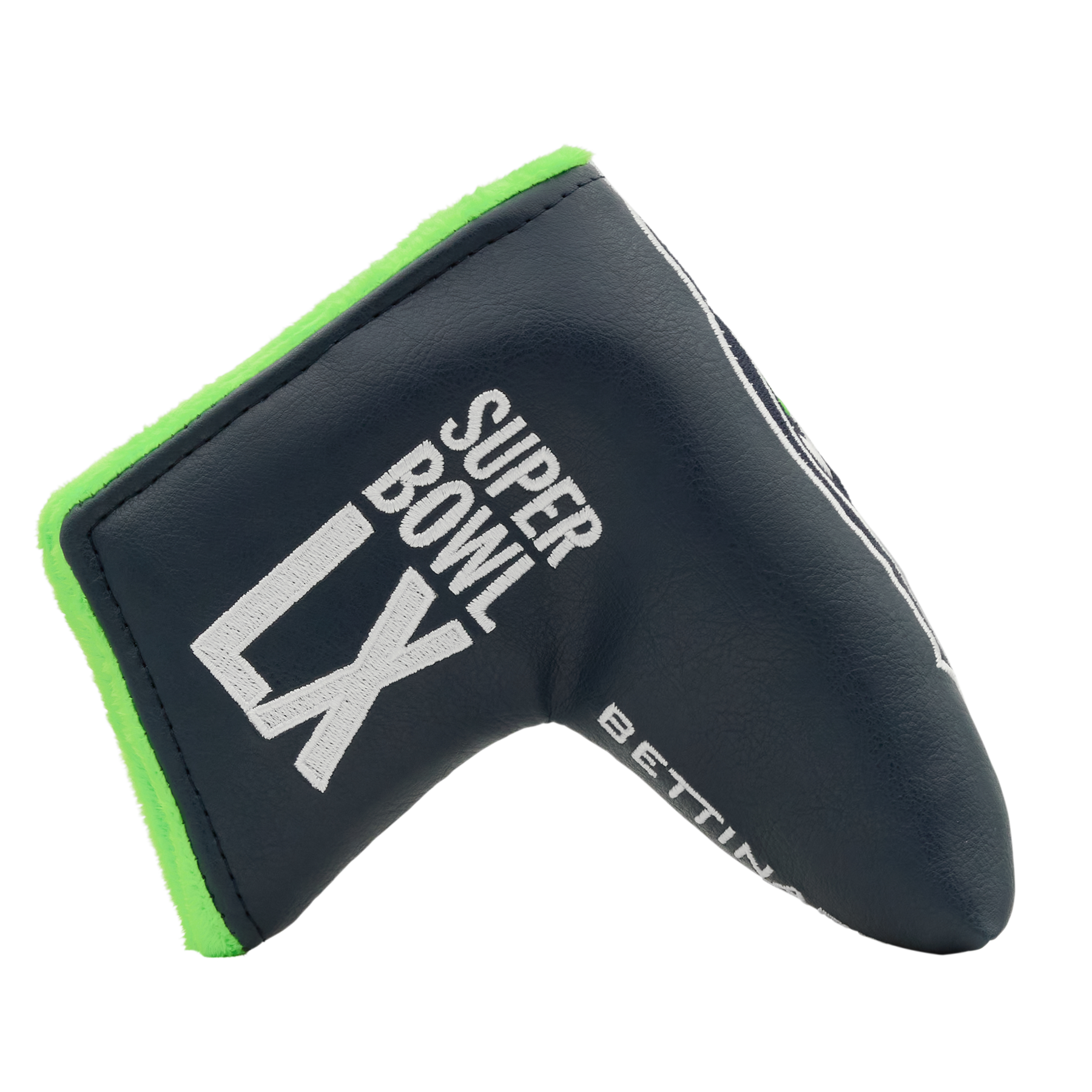 Go Hawks! Celebrate the Seahawks' victory with this two-tone navy and gray blade putter headcover, proudly displaying the Seattle Seahawks logo down the center. One side features Super Bowl LX and Bettinardi wordmarks embroidered in white, while the other features a tonal repeating "CHAMPIONS" pattern with green stars and a Hex B. Finished with a green plush interior and magnetic closure to keep you putter safe and secure while showcasing your Seahawks pride on every green. Available for a limited time only. This item is a pre-order and will ship between 3-5 weeks. All sales final.*