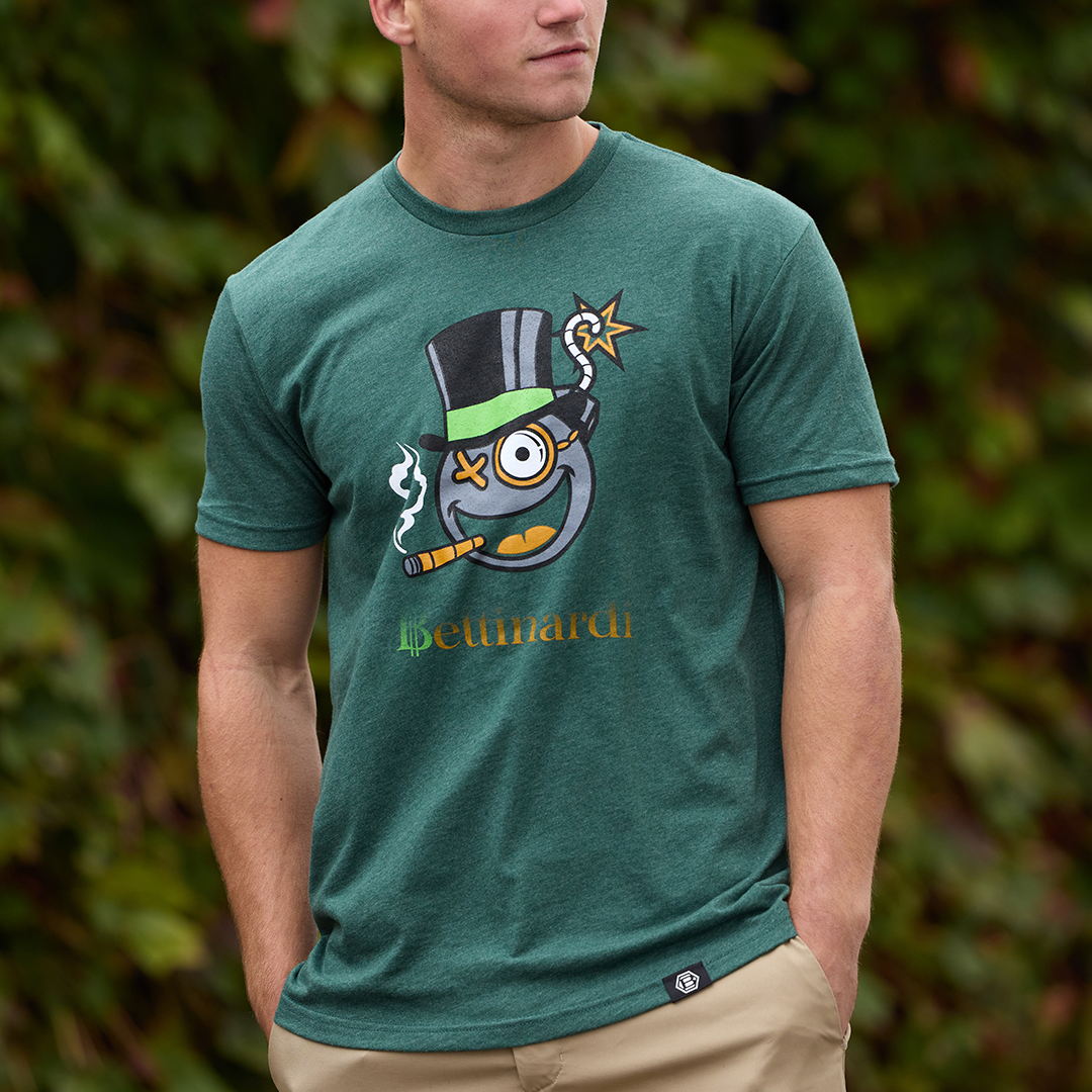 Our Gangster Bomb is up to no good! Featured on a forest green base with Bettinardi and our Gangster Bomb on the chest and a Hex B on the reverse. This t-shirt is perfect for out and about wear or lounging around. (60% combed rings-pun Cotton, 40% Polyester)