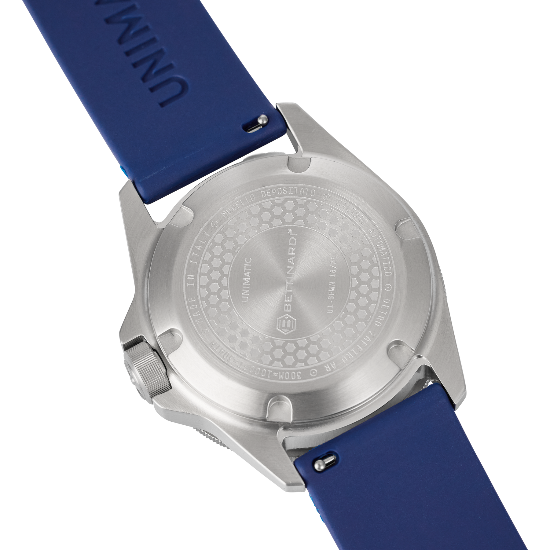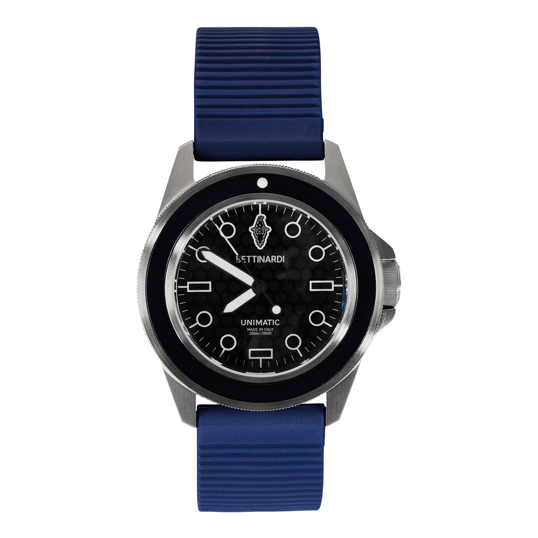 In collaboration with UNIMATIC highlights the shared values of our two brands. This collaborative made-in-Italy diving watch embodies these shared values, featuring a high-legibility black acid etched dial with a Bettinardi signature Honeycomb pattern, a Wizard and UNIMATIC's Super-LumiNova® C3 illuminating the hands and hour markers for the best possible performance in any conditions. UNIMATIC's U1 series is a functional design evolution of the UNIMATIC references and stands as an archetype of the ideal performance timepiece. This watch is distinct with ‘Bettinardi’ and ‘Unimatic’ wordmarks on the dial, while the screw-down caseback is engraved with both brand names and Bettinardi’s Hex B and Honeycomb pattern. Finished with a blue band and comes paired with a glow in the dark matching headcover. Only 25 pieces were made worldwide, and each watch is individually numbered. Limit 1 per person.