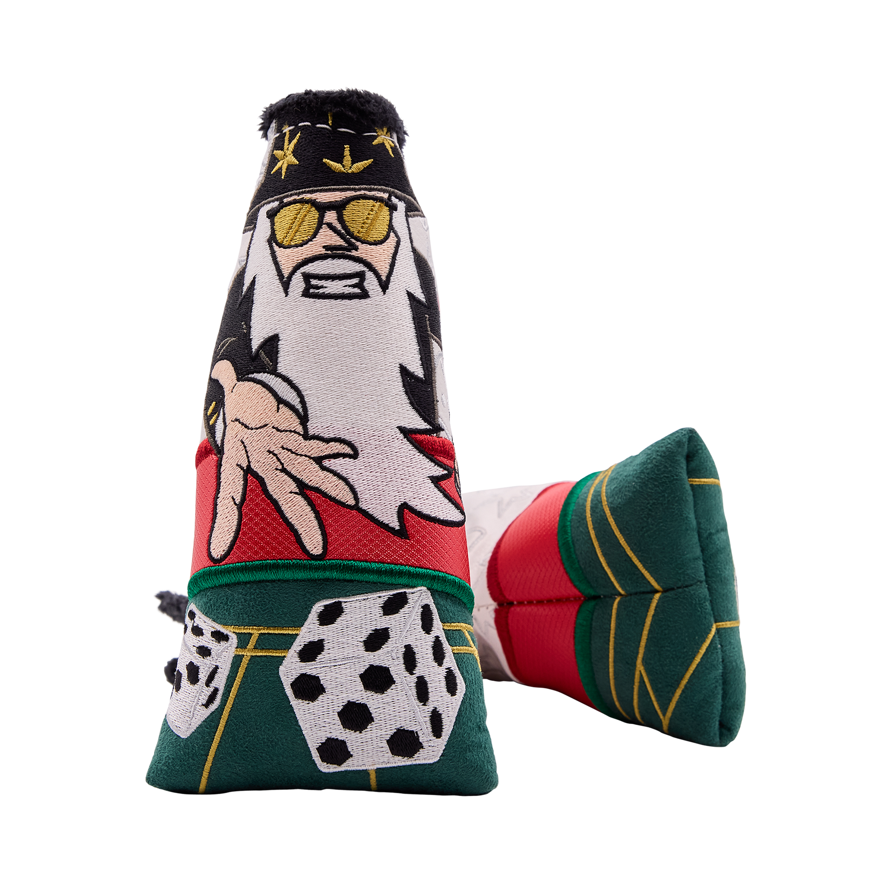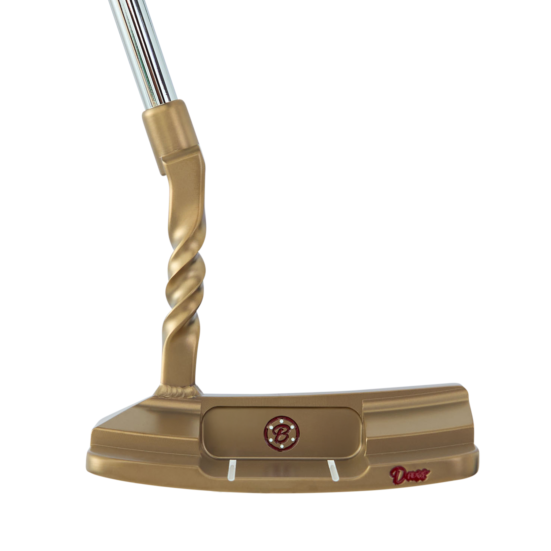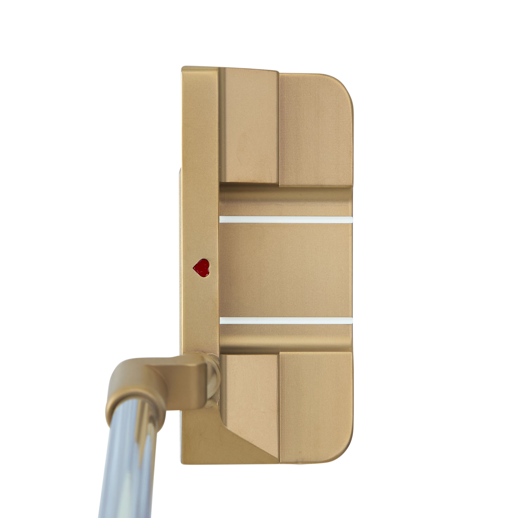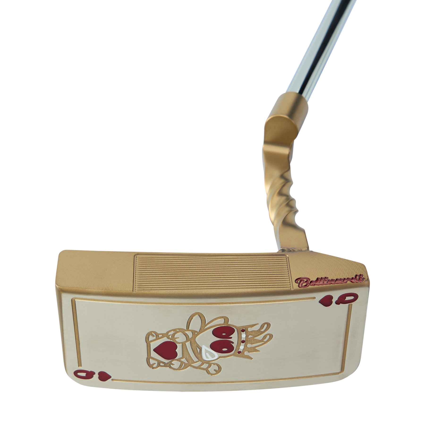 The dealers luck runs deep! Precision milled to 359 grams this radiant QB6 Gold Flame DASS putter features a Queen of Hearts Stinger on the sole, roll control face and accented by a B poker chip in the pocket. Comes complete with a twisted plumbers neck, black HIVE Gripmaster perforated leather grip and The Shooter Wizard Blade Putter Headcover.