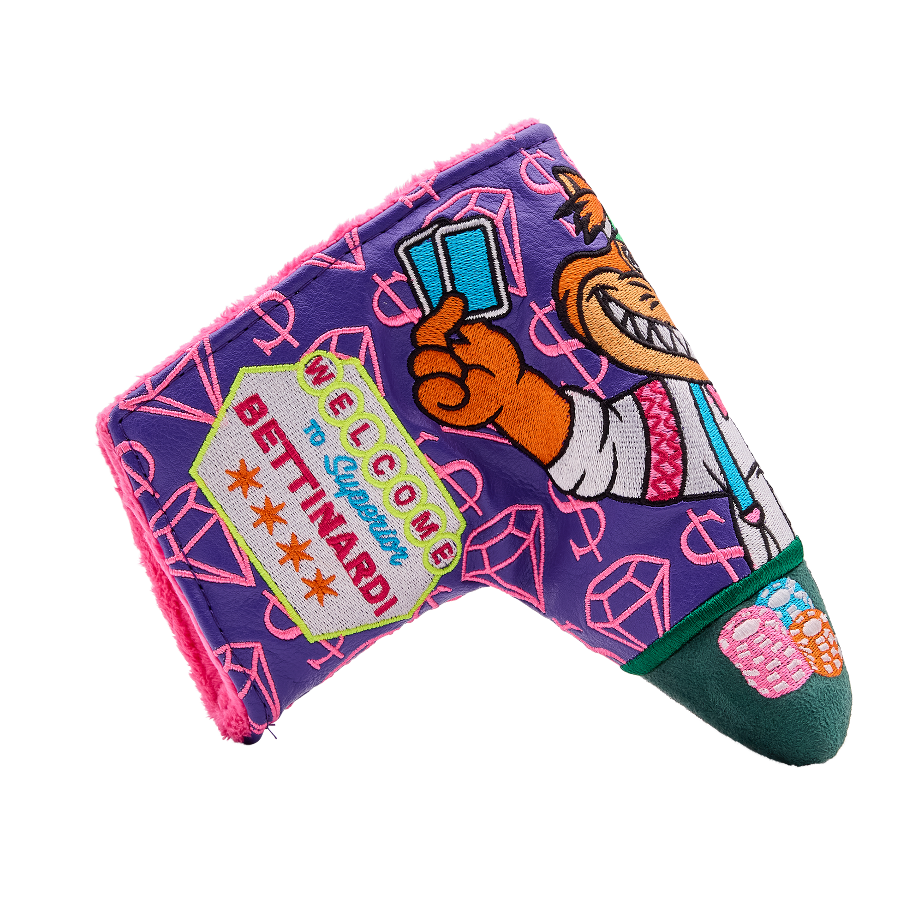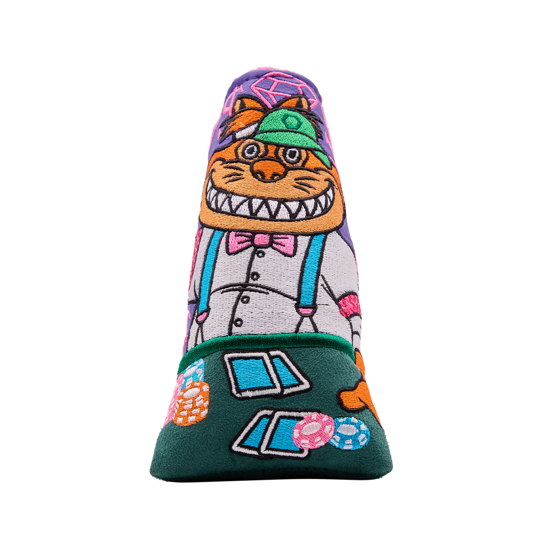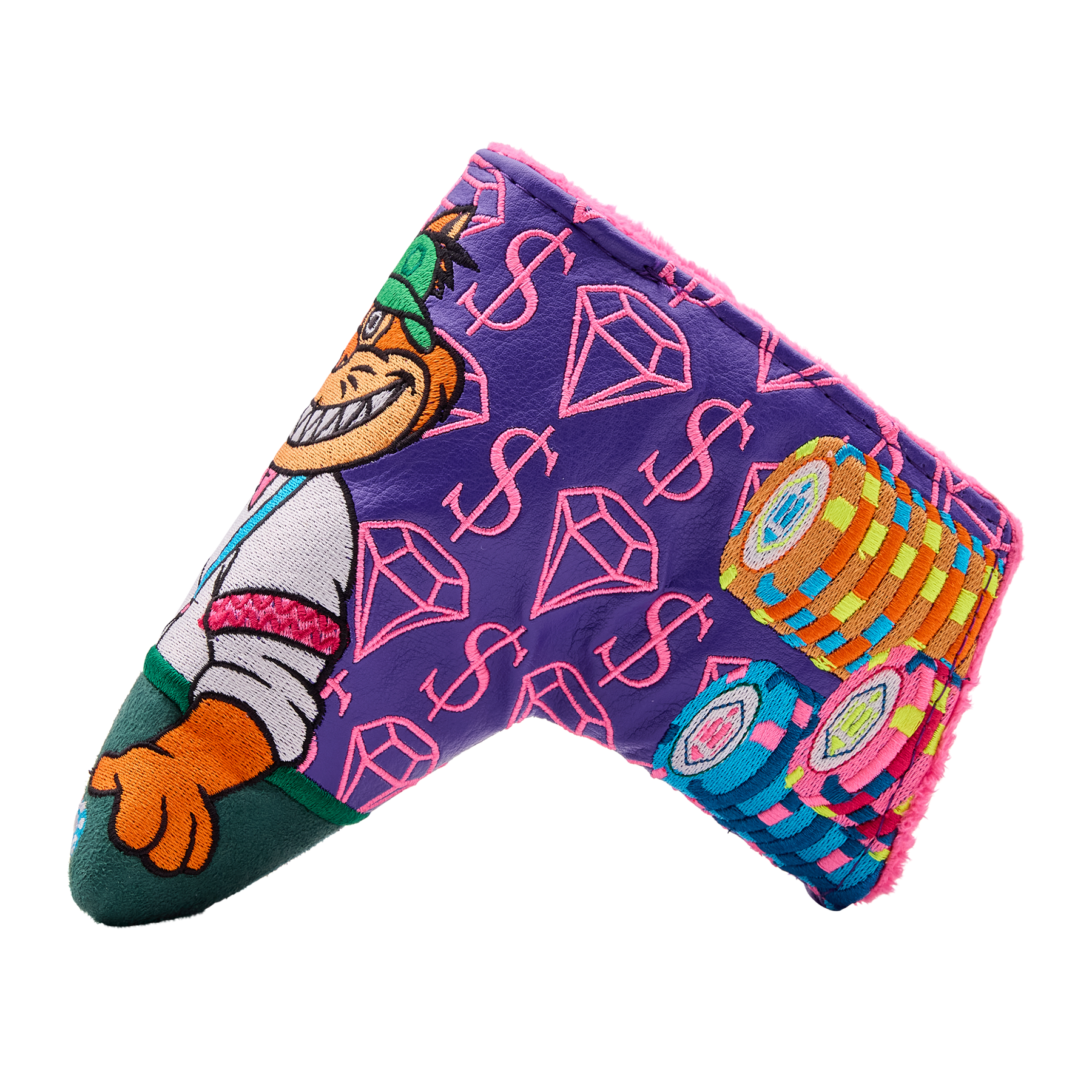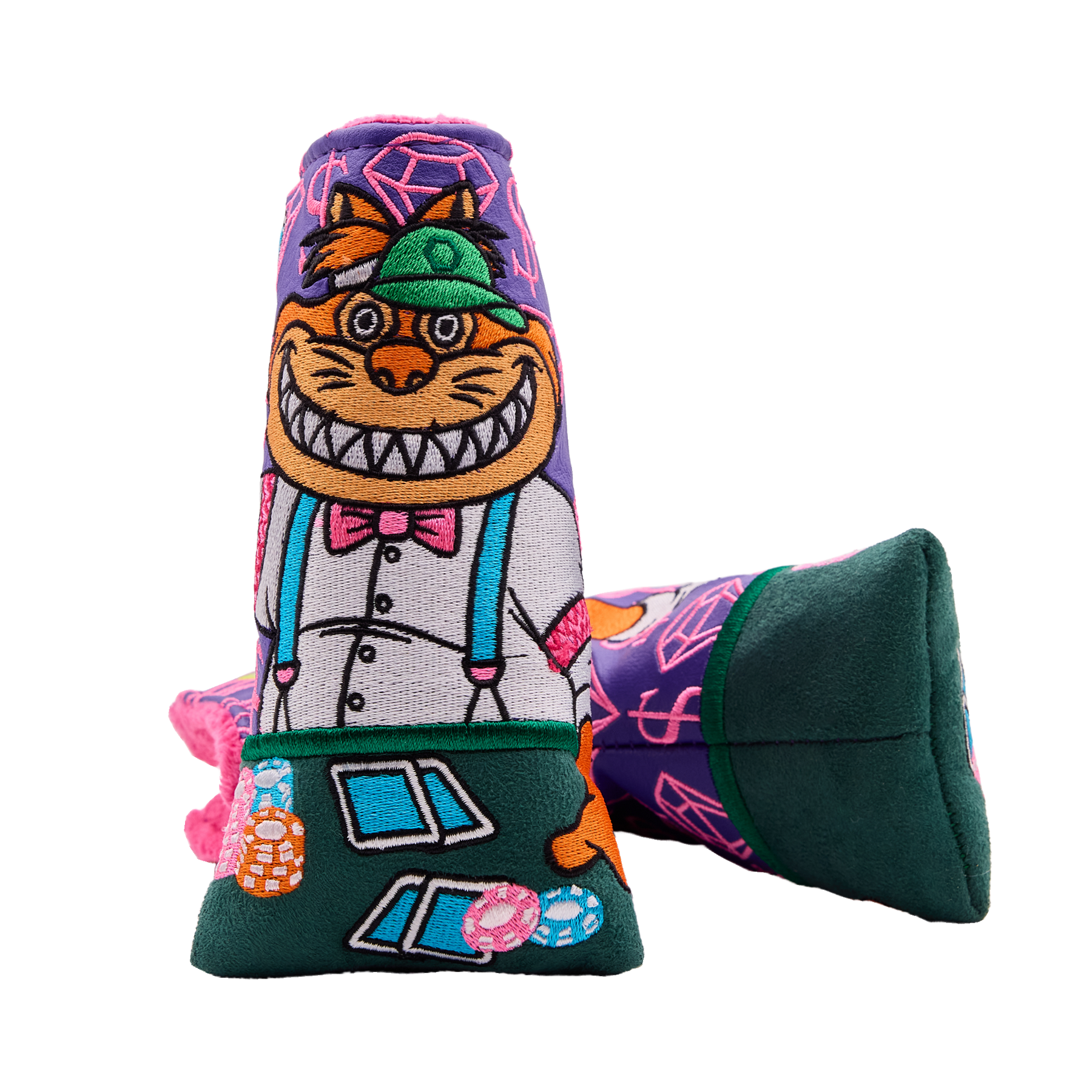 Place your bets! The Dealer Fat Cat is ready to deal you a winning hand. This blade putter headcover is a true showstopper, decked out with diamonds, dollar signs, and the one and only Dealer Fat Cat himself. Finished on a purple base with a green suede casino table, a hot pink plush interior and a magnetic closure. Limited quantities are available. Limit 1 per person. Good luck!