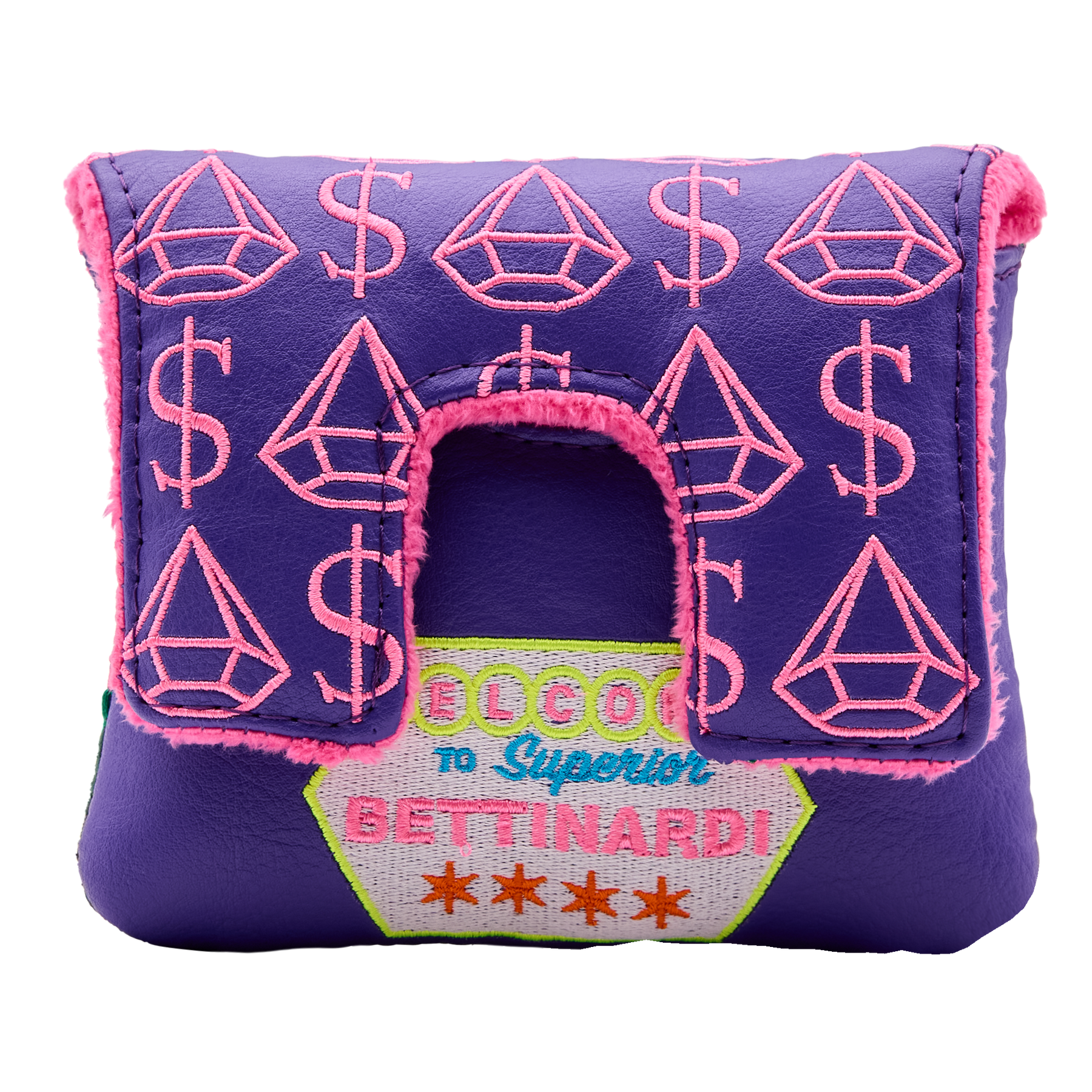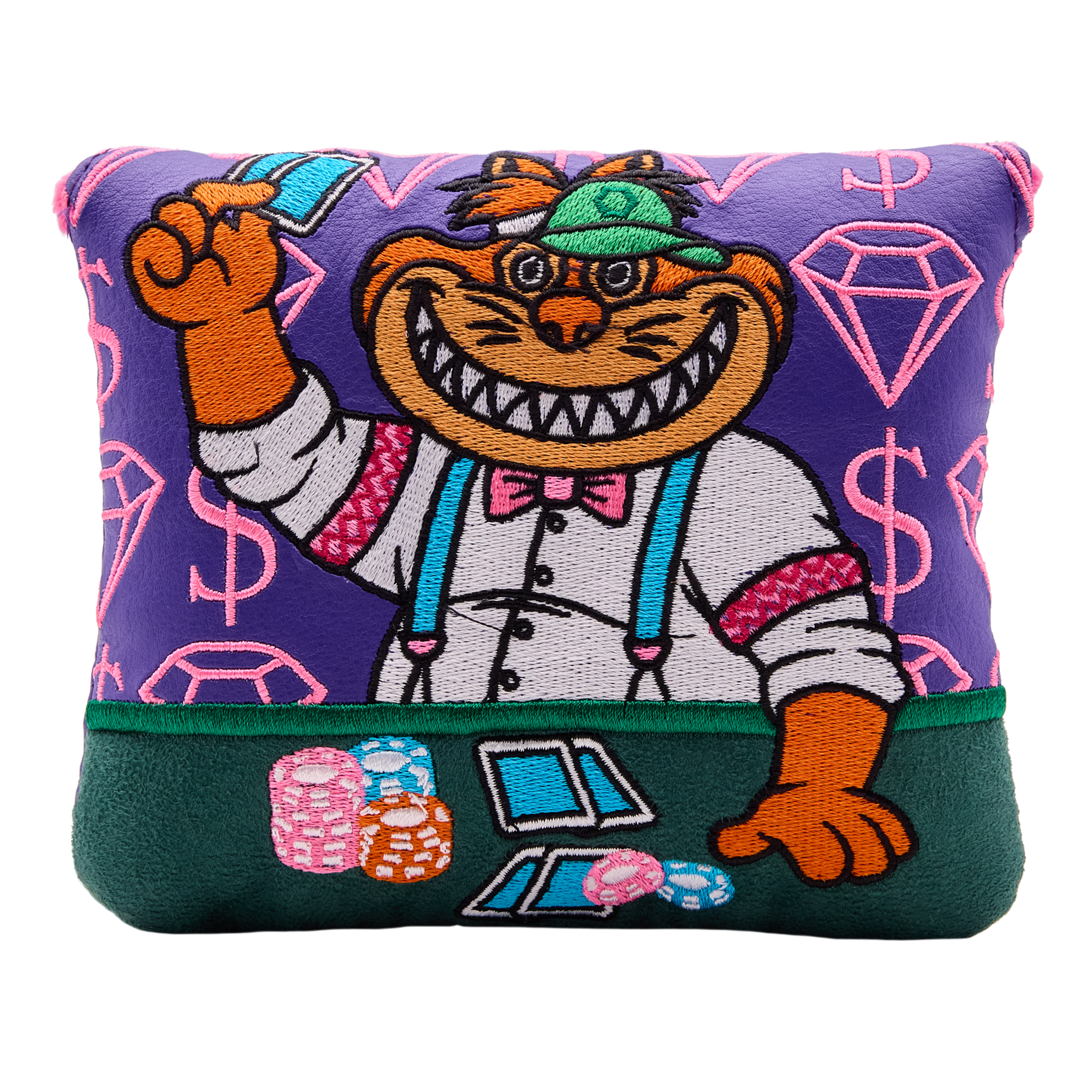 Place your bets! The Dealer Fat Cat is ready to deal you a winning hand. This center shafted mallet putter headcover is a true showstopper, decked out with diamonds, dollar signs, and the one and only Dealer Fat Cat himself. Finished on a purple base with a green suede casino table, a hot pink plush interior and a magnetic closure. Limited quantities are available. Limit 1 per person. Good luck!