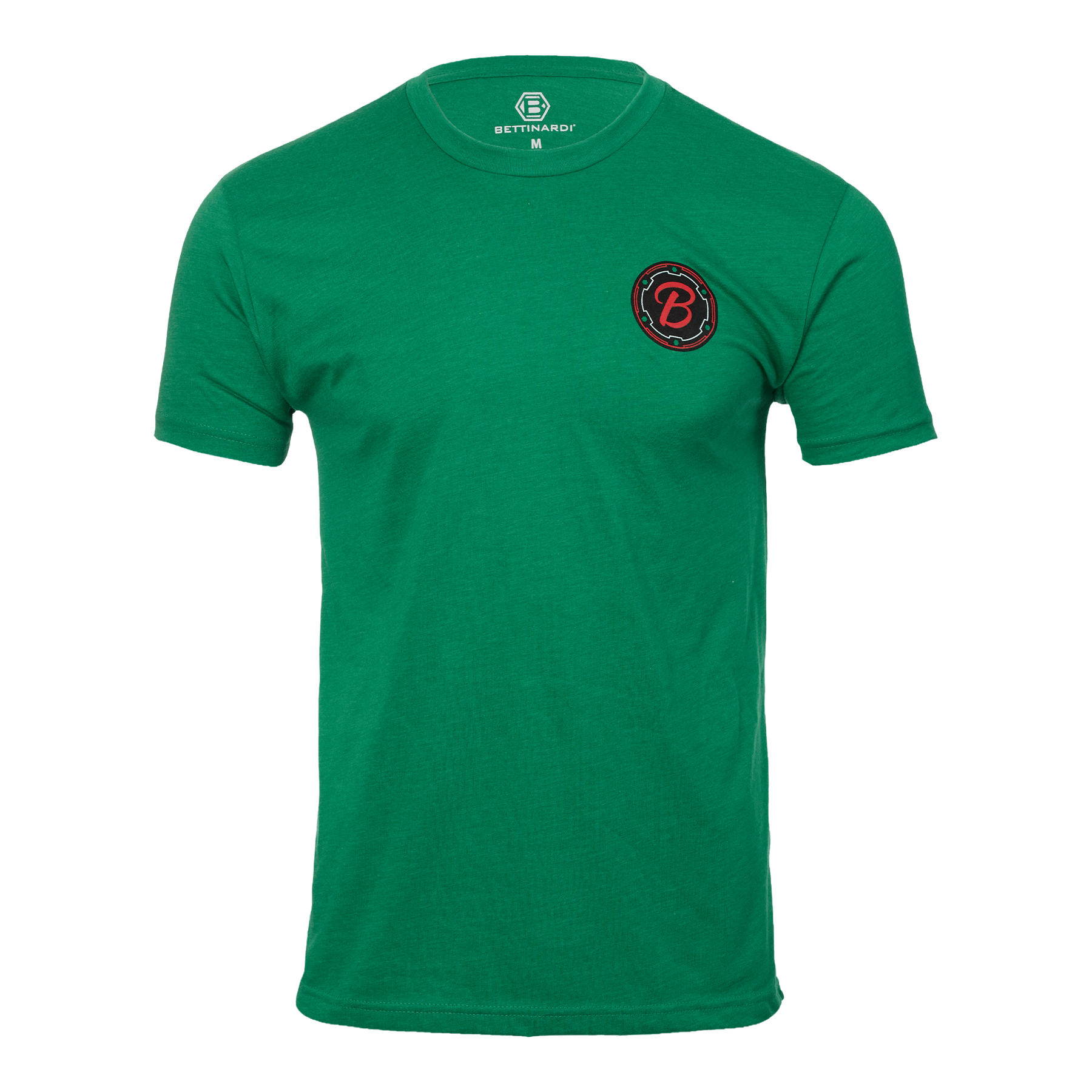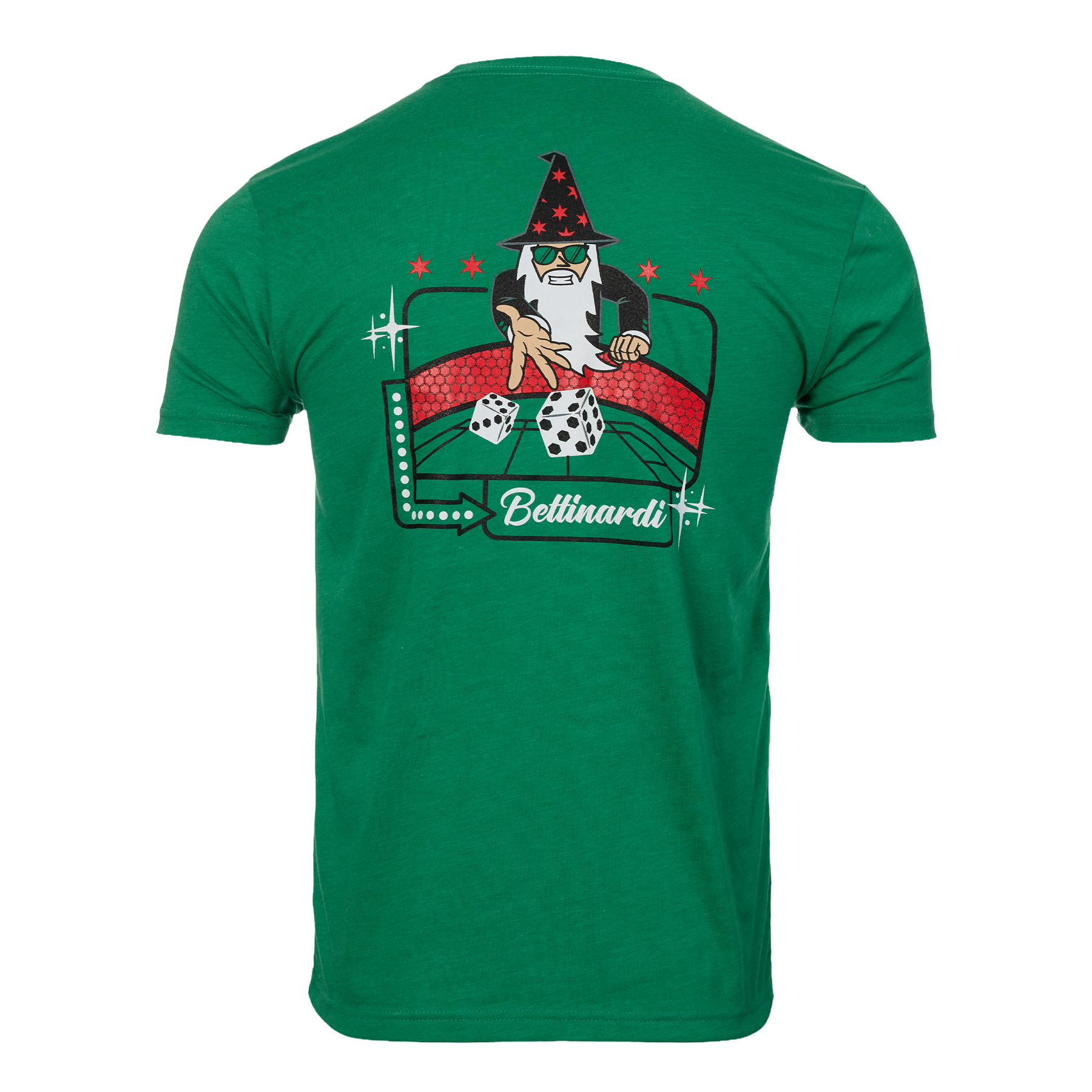 Let it ride! The Shooter Wiz is taking his chances with every toss. This kelly green t-shirt features a B poker chip on the front left chest and our Shooter Wiz on the back. (60% combed rings-pun Cotton, 40% Polyester)
