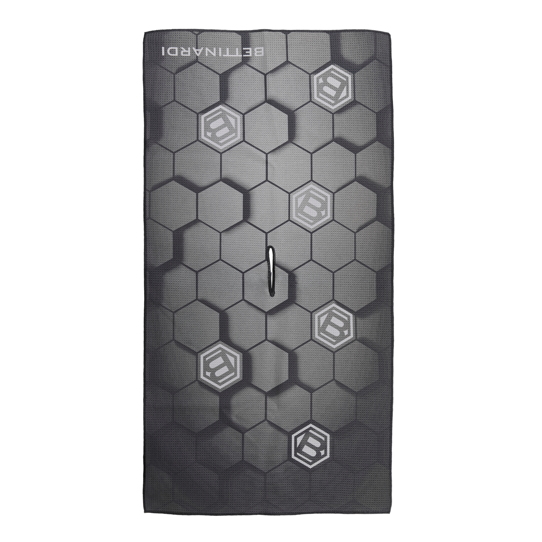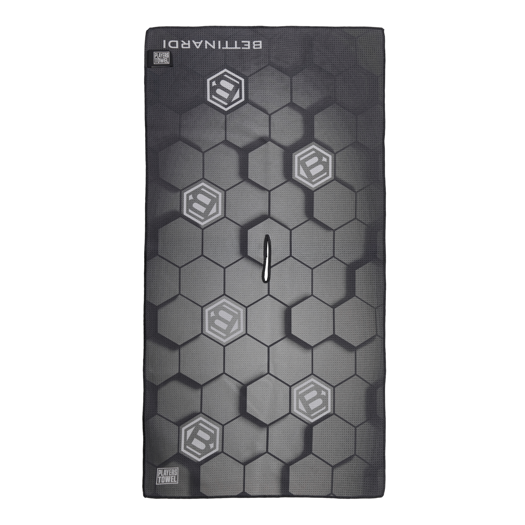 Keep your clubs clean and dry with the 3D Hex B Players Towel. Made in the U.S.A. with premium microfiber, this towel features a pattern of 3D Hex Bs on both sides with bold Bettinardi wordmarks on each side. The black and gray will look sharp on any golf bag.