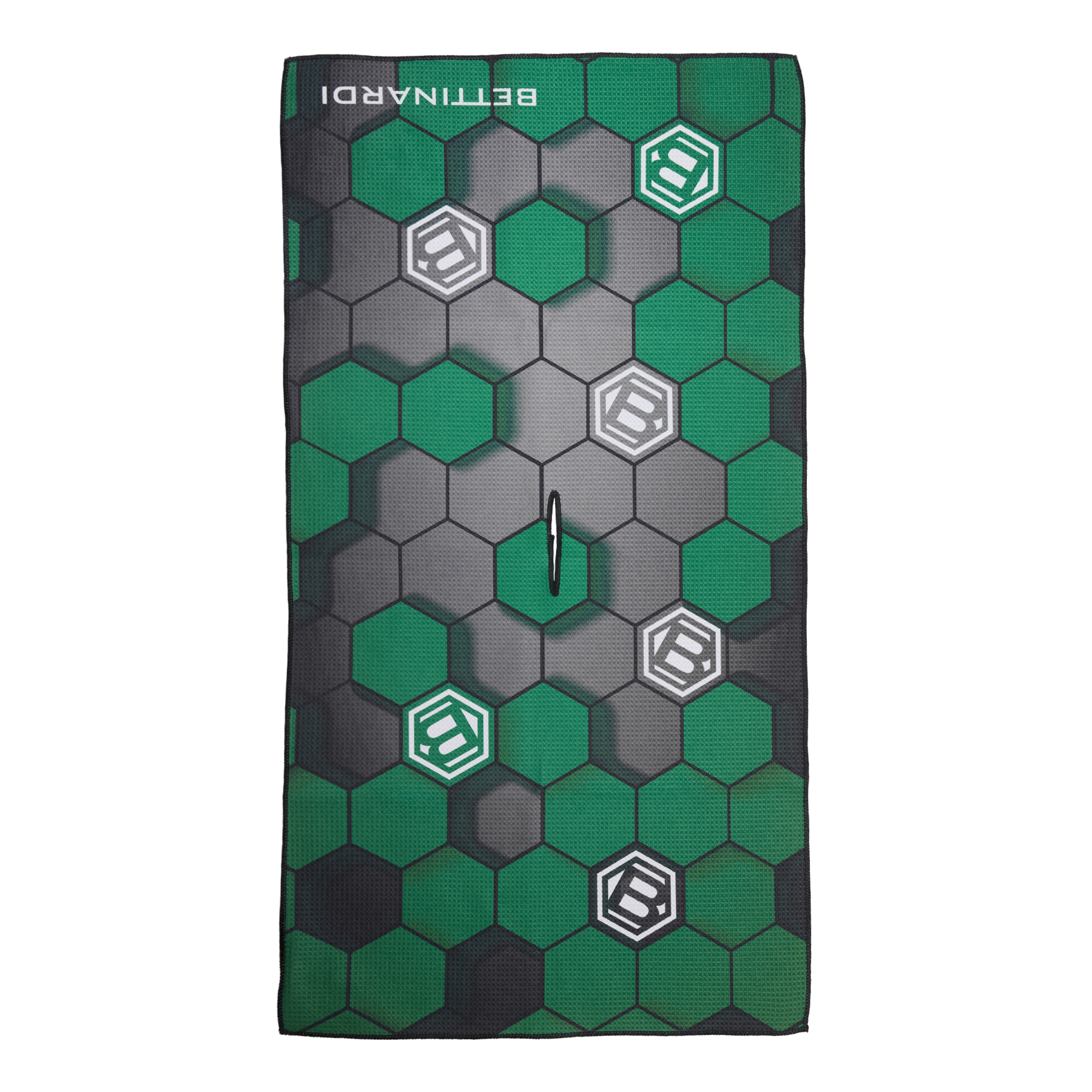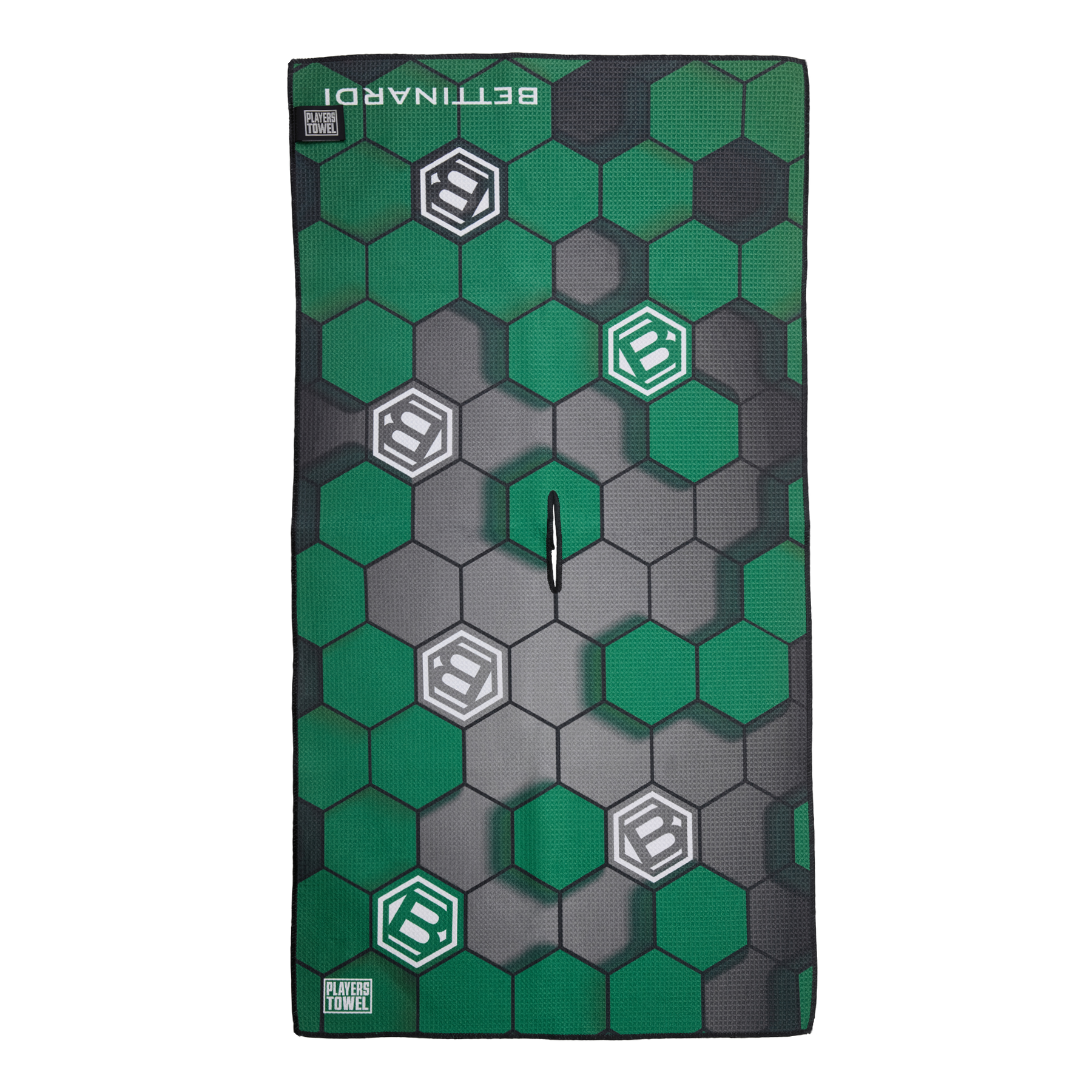 Keep your clubs clean and dry with the 3D Hex B Players Towel. Made in the U.S.A. with premium microfiber, this towel features a pattern of 3D Hex B's on both sides with bold Bettinardi wordmarks on each side. The black, green, and gray colorway will look sharp on any golf bag.