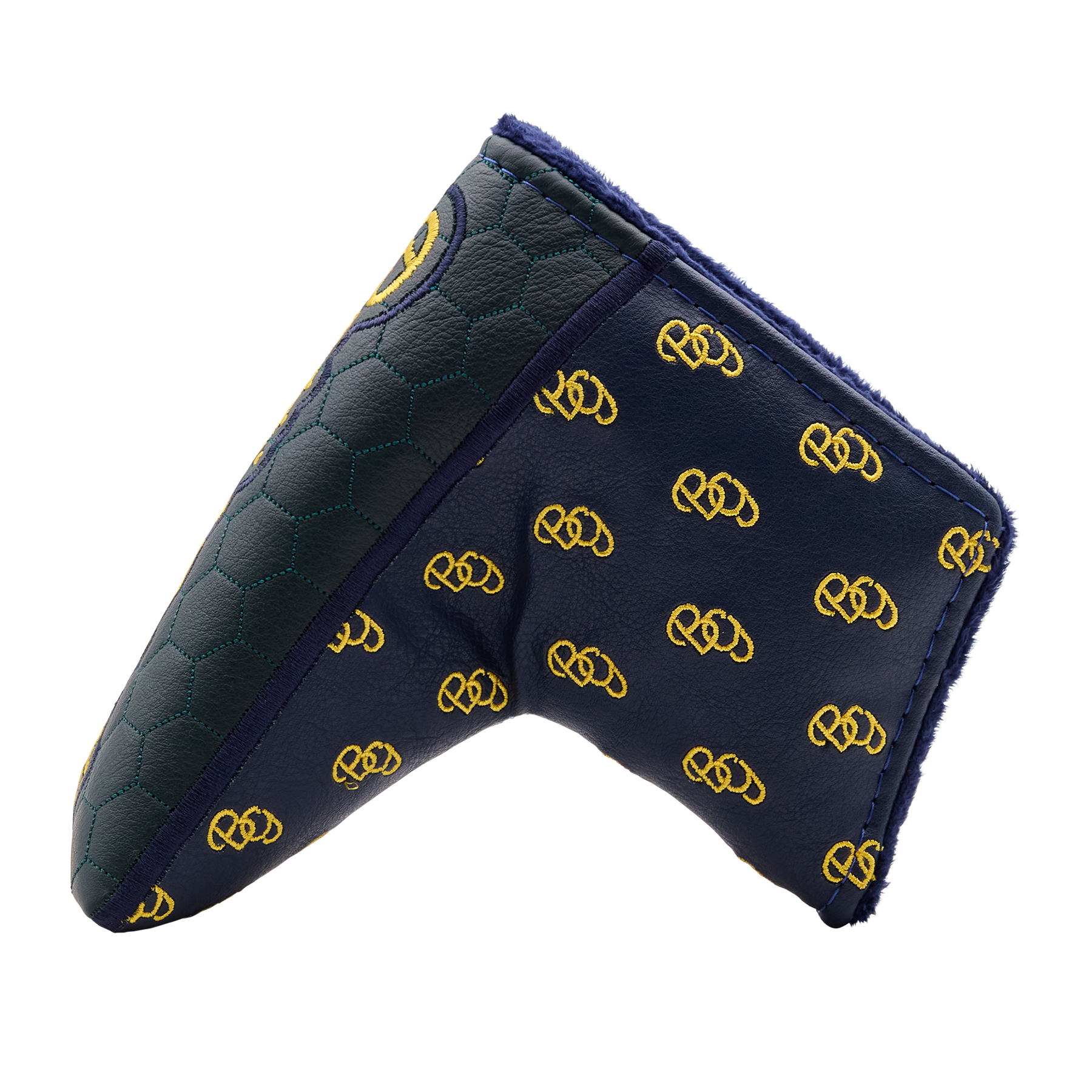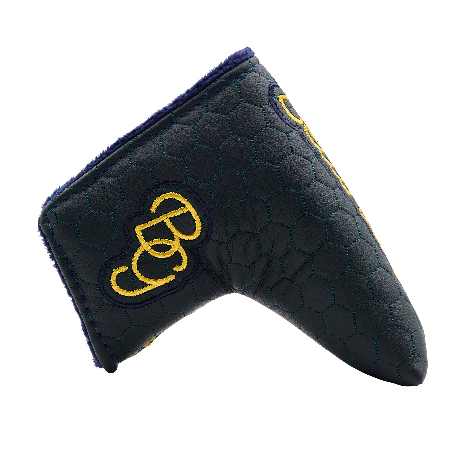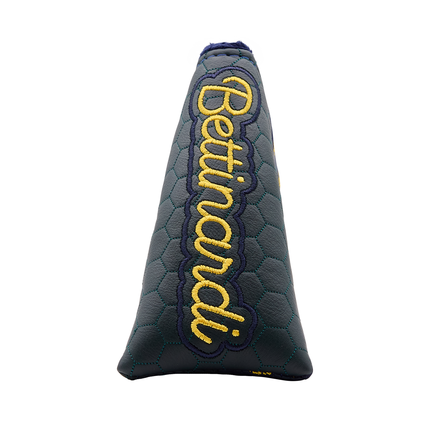 The BG Script blade putter headcover features a sleek honeycomb pattern throughout the green base and our signature BG script stitched onto the navy. This two-tone headcover is finished with a navy plush interior and magnetic closure.