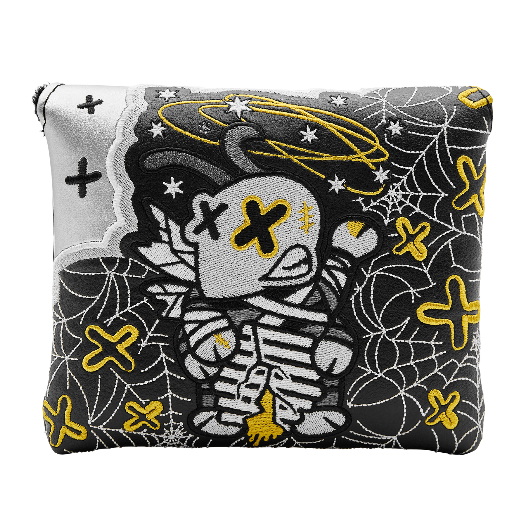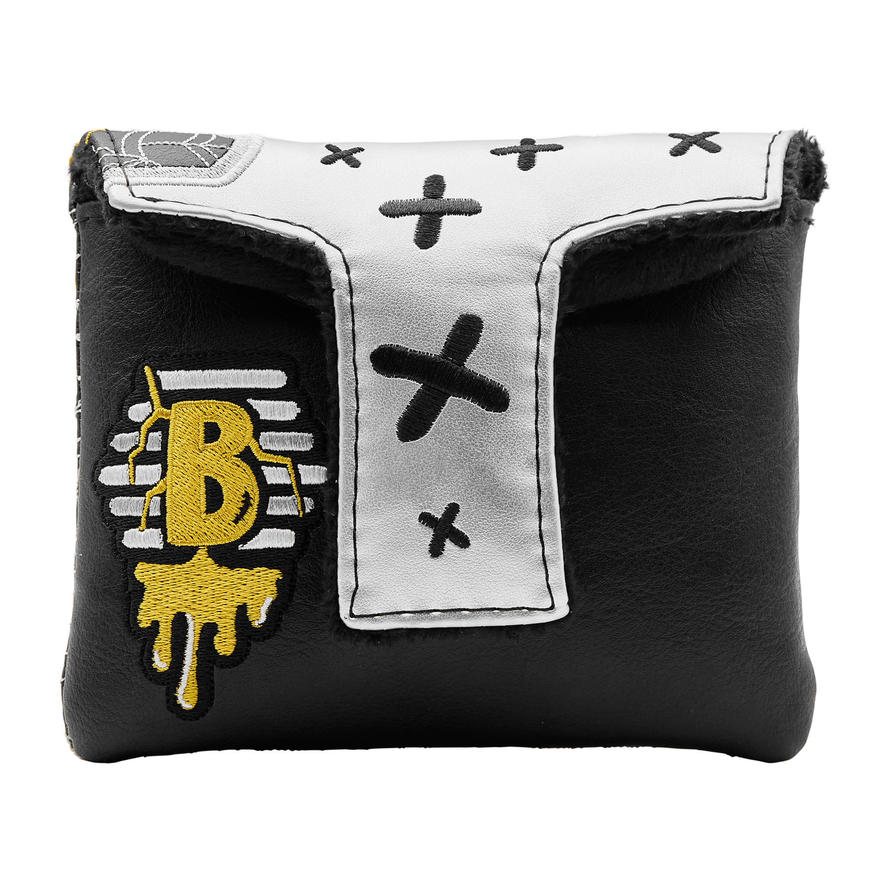 No use crying over spilled honey! This mallet putter headcover displays the Unlucky Stinger with his broken honey pot embroidered in grayscale over a pattern of silver webs and gold X's. Finished with a black plush interior and magnetic closure, this headcover brings all the boldness, even when luck runs out. Limited quantities are available. Limit 1 per person. Good luck!